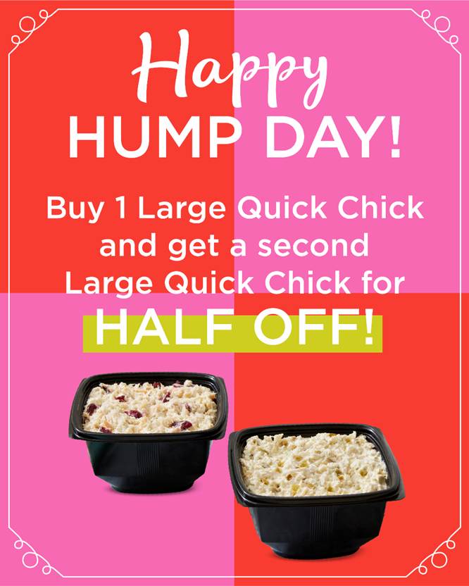 *Every Wednesday in February, buy a Large Quick Chick and get a second Large Quick Chick for half off. Mention “Hump Day” at checkout to redeem in-store and in Drive Thru or redeem online by entering code “FEB26” at checkout.