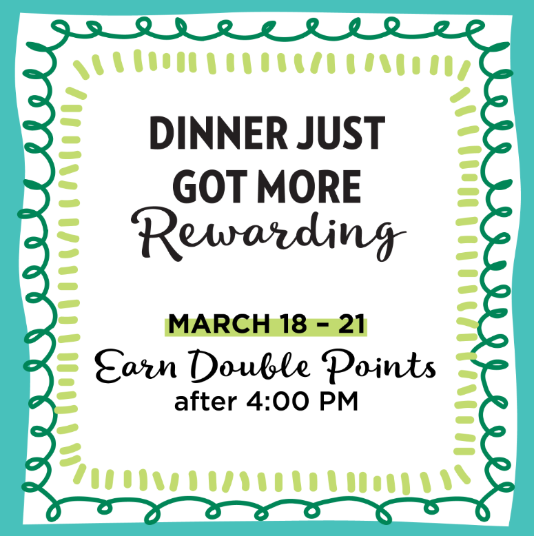 *Double points will only be received for purchases made on 3/18 - 3/21 at or after 4PM at participating locations. Points will be automatically added to your Chicken Salad Chick account within 24 hours of scanning at the register or retro-claiming your receipt.